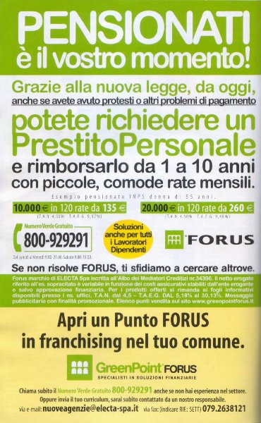 Ultimamente va molto di moda farsi fare dei prestiti di poche migliaia di euro, e le aziende che forniscono tali finanziamenti fanno a gara per accaparrarsi la fetta più grossa del mercato. Le pubblicità letteralmente si sprecano: c'è il prestito ad alta digeribilità, il prestito comodo, il prestito a condizioni speciali, il prestito personale... Signore signori, il prestito è servito !!!